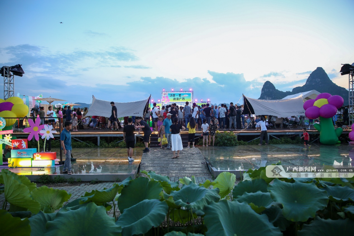 夜幕下的活动现场。 本次活动围绕“荷文化”主题,设置了“荷塘乐色”夏日音乐会、“荷风雅韵”夏日好物集、“荷苑寻宝”趣味游园、“荷美华服”国风摄影、“爱莲诗会”以诗会友、“禅茶荷韵”茶艺品鉴、“荷乡夜宿”星空露营等系列“荷”式体验,带来了夏季文旅新玩法。同时,联合柳江区百朋荷苑景区举办“荷香万里”休闲农业展,向市民群众和游客展示柳州百朋镇培育的特色荷花品种、产业发展成果,助力乡村振兴。