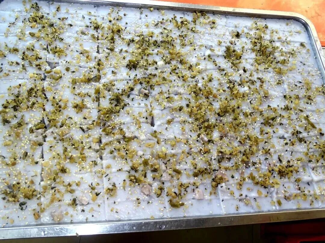 融安油糕:用米加水磨成糊状,加入当地的槟榔芋头,蒸制。蒸制好后,用当地的小洲头菜(一种咸菜)、葱、碎花生放置在油糕上方,即可入食,口感相当好。