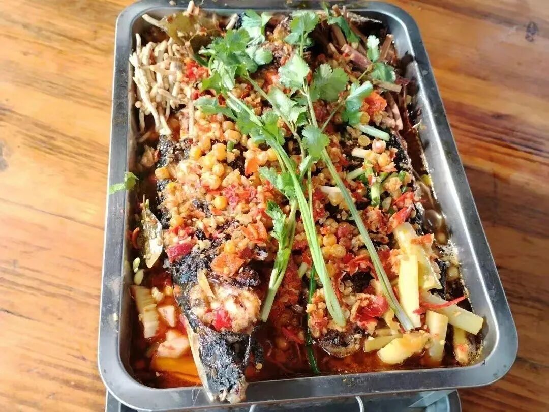 龙妙烤鱼:炭火现烤,肉质厚实,配料丰富,酸辣可口。